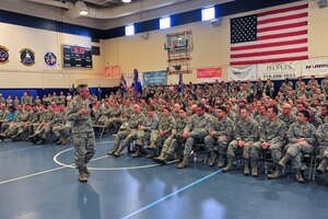 Air Force Reserve Col. Damon S. Feltman, 310th Space Wing Commander, held a commanders call, the first of two for 2015.At his commanders call, Feltman handed out awards and shared his expectations and vision on commitment, space training transformation and mission, military one source and the