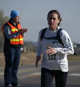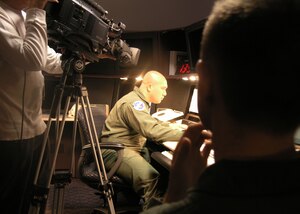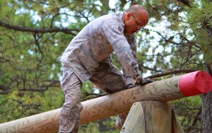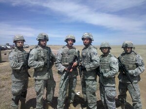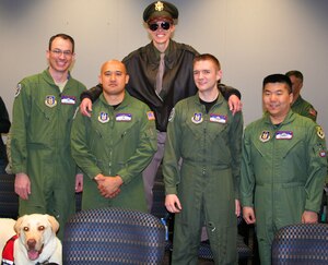 The 6th Space Operation Squadron Guardian Challenge team from left, Maj. Jeremy Edwards, Tech. Sgt. Uriah Nomura, Senior Airman Thomas Hastings, and Maj. Minpo Shiue pose with the 6SOPS Bombardier mascot, Maj. Judy Kelley (back row) and the canine mascot Nugget prior to competing in Guardian
